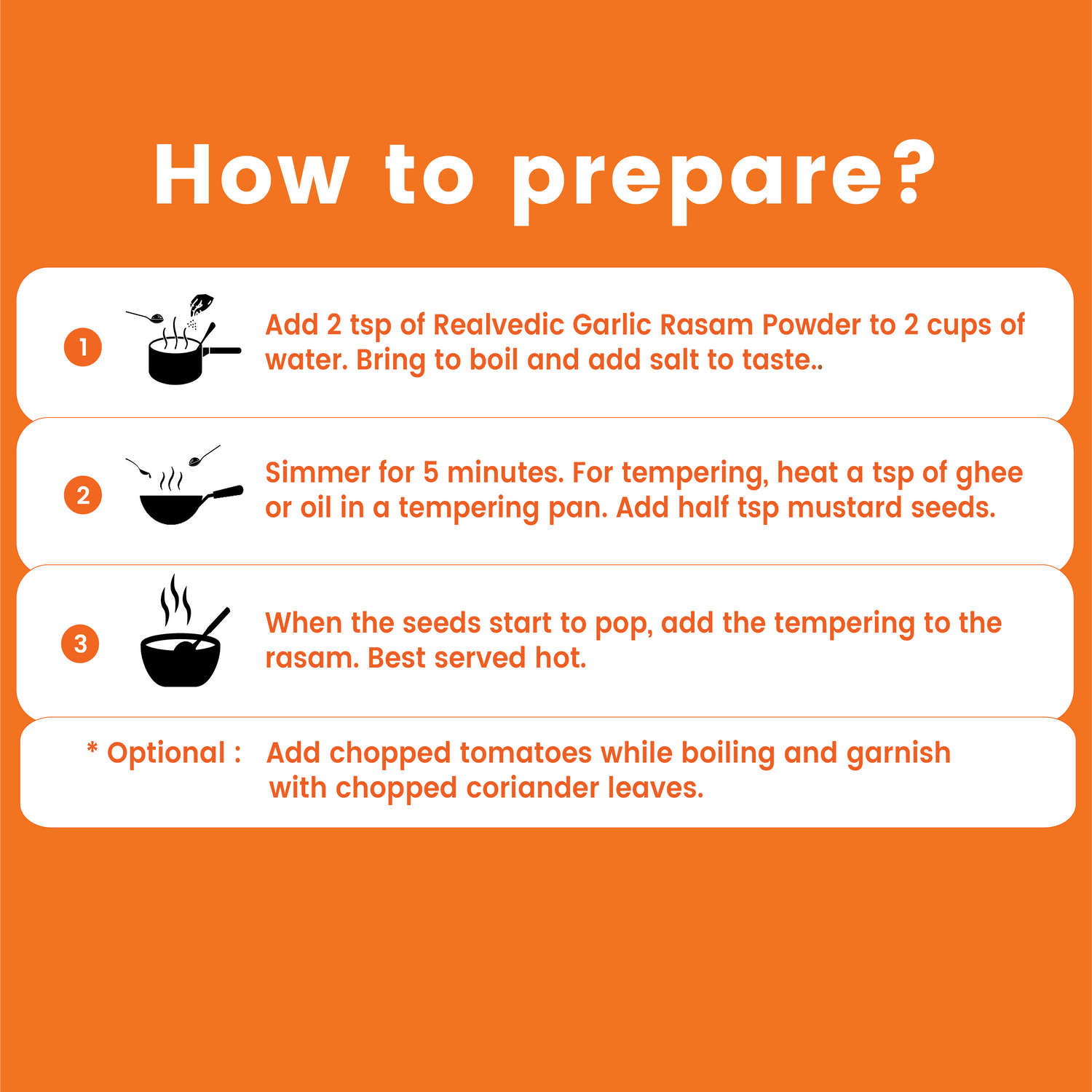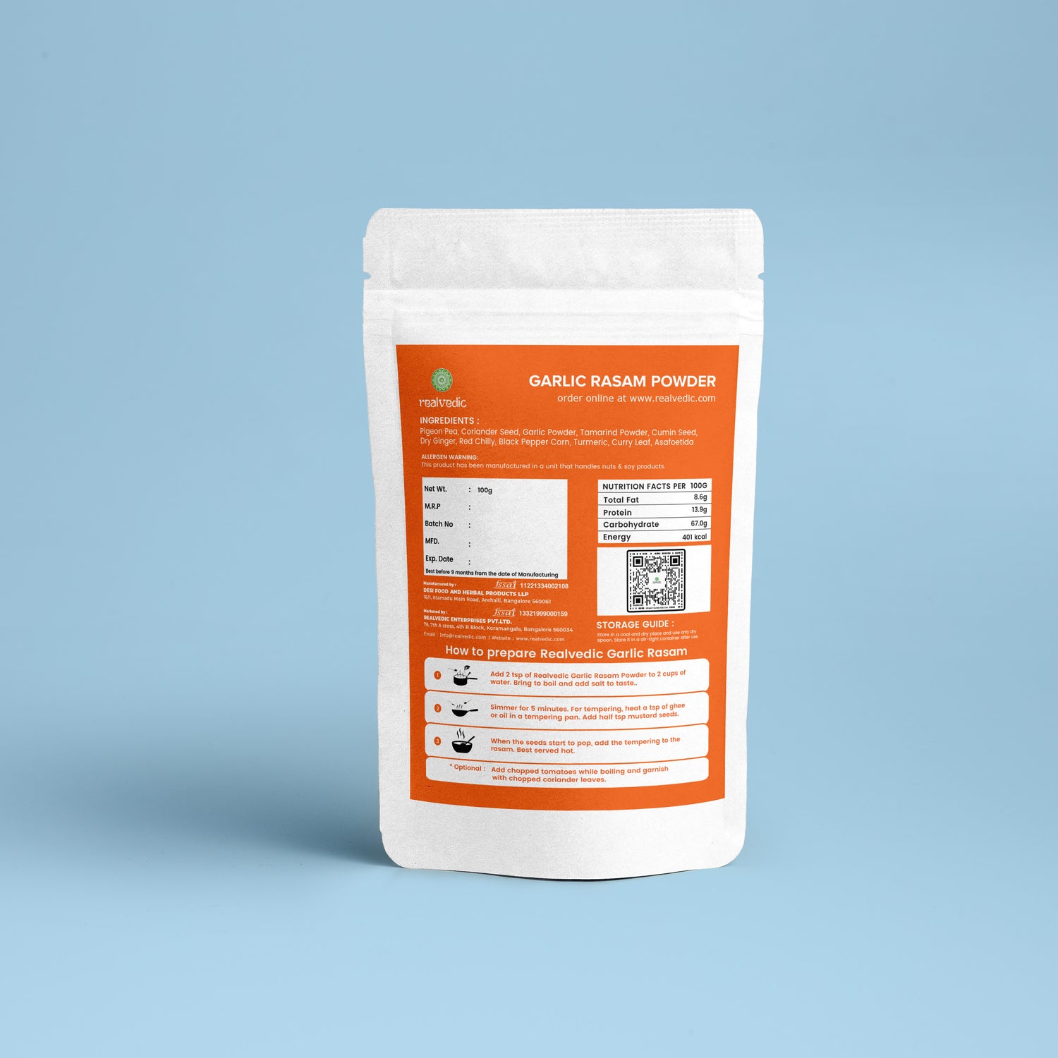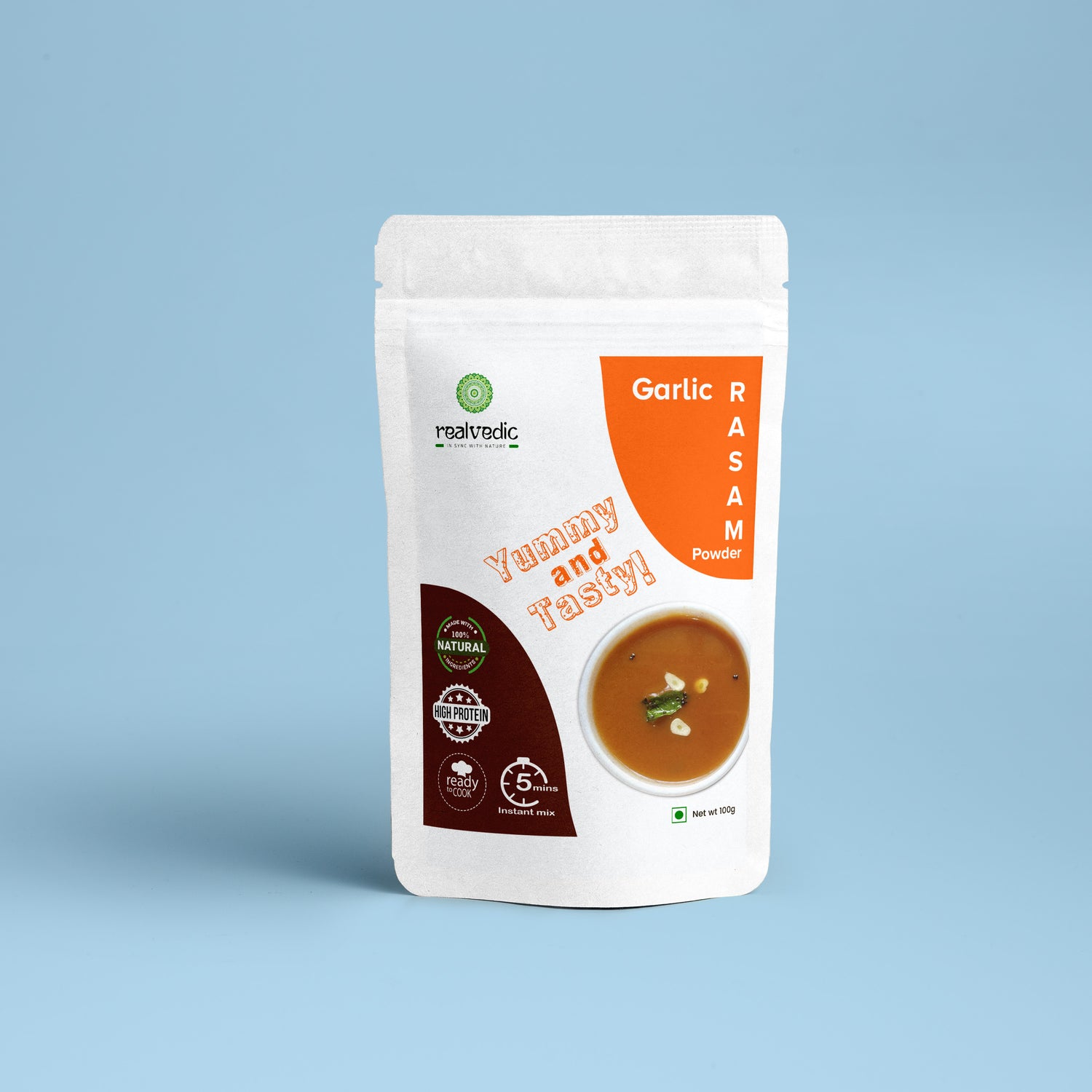 Garlic Rasam is a popular soup that offers great health benefits. Garlic in itself has its list of advantages, when mixed with the other ingredients, it acts as a potion for many health conditions like gastritis, cardiac health, high cholesterol, etc. RealVedic Garlic Rasam Powder is a mix of nutritious spices, lentils blended with garlic that is great in taste and easy to make.